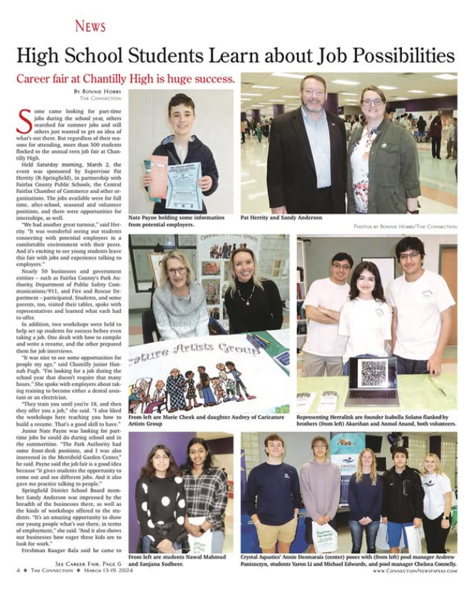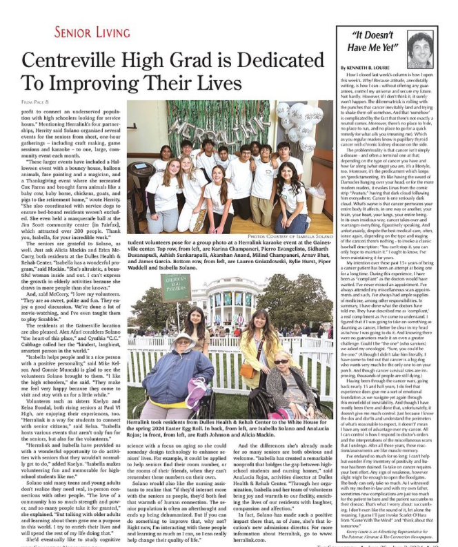 "Solano’s work caught the eye of Supervisor Pat Herrity (R-Springfield), who praised her for connecting thousands of students with senior citizens who, otherwise, would be alone. In May, the Fairfax County Board of Supervisors recognized volunteers throughout the county during its Volunteer Services Awards ceremony. Recommended by Herrity, Solano was honored as the Springfield District Community Champion. ”